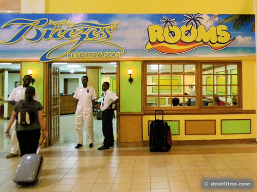 À notre arrivée aux douanes de Montego Bay, nous avons eu la surprise d'avoir à se présenter au bureau de la santé publique parce que nous avions visité la République dominicaine moins de six semaines auparavant (lire malaria). Il a fallu remplir un questionnaire de santé. Une fois terminés, nous nous présentons à la loge Breezes en attente du transfert à l'hôtel. Nous n'étions que quelques couples dans l'autobus desservant le Breezes Trelawny, Rio Bueno et Runaway Bay dont seulement 4 personnes pour le Rio Bueno. À la demande de touristes, l'autobus fait un arrêt pour bières et autres boissons.