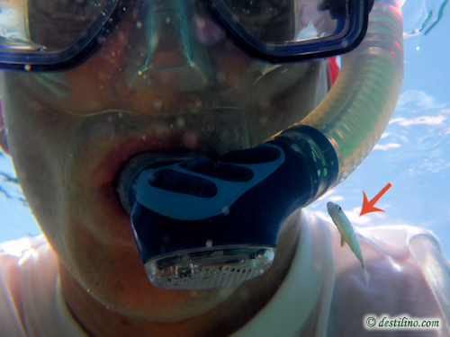 poisson est tombé en amour avec moi :o) il m'a suivi tout au long de notre plongée, il me suivait collé sur mon masque. Pauvre petit, j'ai dû l'abandonner en sortant de la mer!