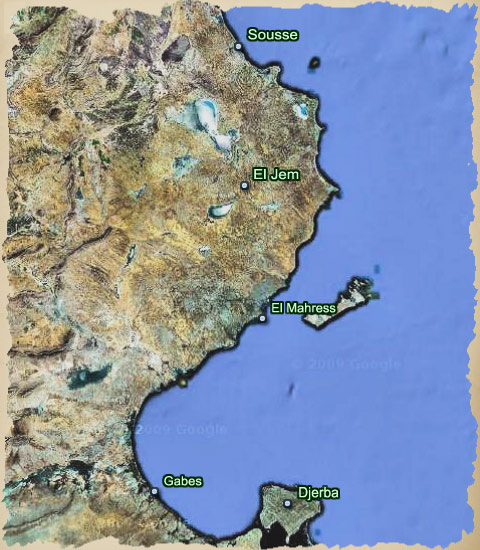 Départ @ 7 h pour le long trajet vers Djerba. Visite de l'amphithéâtre de El Jem. Pause au café Casablanca de El Mahress. Sur la route entre Mahress et Gabes nous croisons plusieurs boucheries « à ciel ouvert », des commerçants d'essence en bidons ainsi que des vendeurs d'articles divers que leur voisin libyen semble bien apprécier. Diner à l'oasis maritime de Gabes. Départ @ 15 h pour le traversier vers l'île de Djerba (15 min). Visite de la plus vieille synagogue au monde « La Ghariba ». Temps libre dans les souks de Mimosas. Arrivé à l’hôtel El Mouradi Djerba Mensel @ 18 h 30.