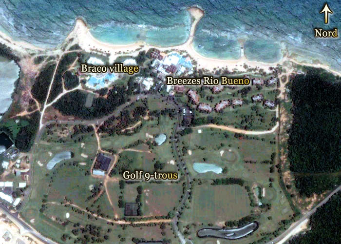 Notre chambre (suites 3008 dont la description de Breezes est « Au Naturel One Bedroom Beach Front Suites » est situé dans le premier bloc une fois passé la sécurité, car le Braco village est une section exclusive de l'hôtel. Il faut montrer notre bracelet (bleu) qui nous identifie comme clients. Il est possible d'acheter une passe d'une journée pour les clients du Rio Bueno qui désirent visiter la section Braco village, mais le coût est élevé.