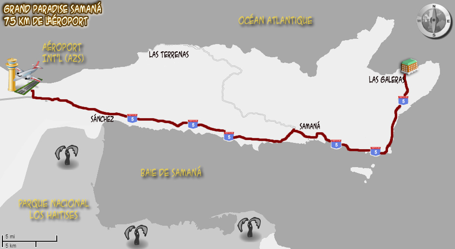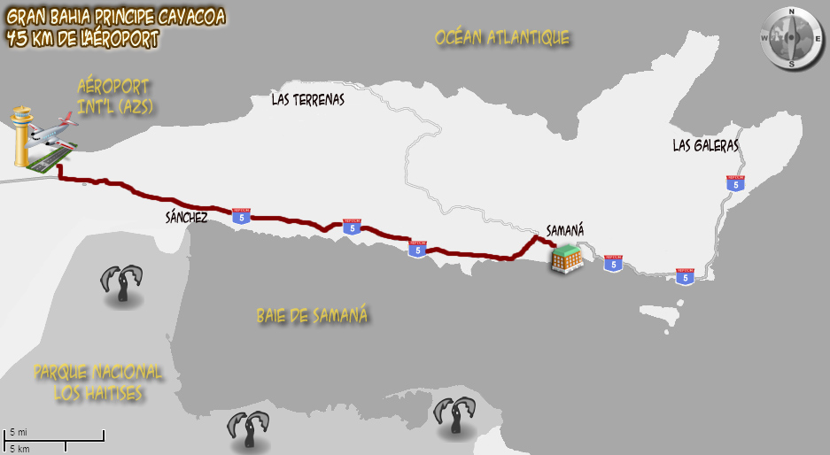 Les hôtels de Samaná sont desservis par l'aéroport international El Catey Juan Bosch (AZS) inauguré le 7 février 2007, mais en service depuis le 6 novembre 2006. L'aéroport est situé à environ une heure du Gran Bahia Principe Cayacoa et une heure trente du Gran Bahia Principe El Portillo. C'est un aéroport neuf, climatisé, offrant plusieurs services, dont un magasin hors-taxe, restaurants, salon VIP, etc. Cliquer ICI pour voir nos photos de l'aéroport et ses services. Les autocars sont climatisés et les routes pour desservir les hôtels sont en bitumes. Comme certaines de ces routes sont amochées, il y a beaucoup de travaux de rénovation des routes. D'ici quelques années, le transfert sera surement plus court et plus agréable.