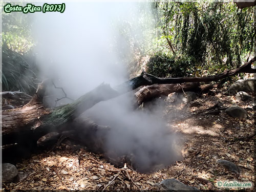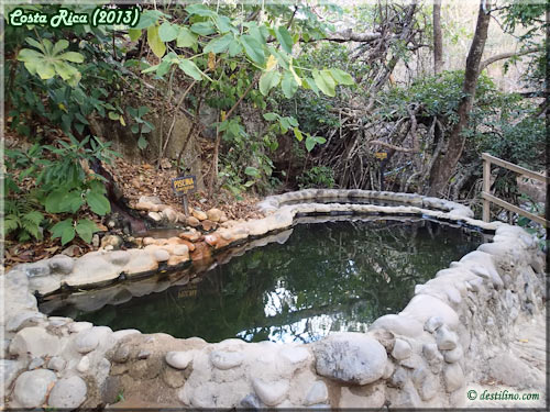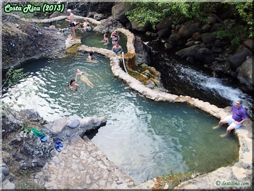 Au retour en après-midi, nous décidons d'aller visiter le site des eaux thermales du Rio Negro situé à une quinzaine de minutes au nord de l'Hacienda. Lily décide de nous accompagner en béquilles. Le chemin n'est pas trop difficile, sauf pour l'arrivée aux bains où il y a une bonne pente. Le site est divisé en deux secteurs par le Rio Negro. Au Nord, il y a trois bassins d'eau à 38, 39 et 40 degrés Celsius. La température est « contrôlée » par un tout petit bassin alimenté directement de la source thermale et dont une roche bloque ou laisse entrer l'eau de ce bassin dans le bain principal.