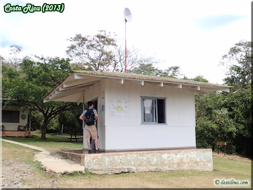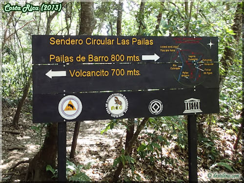 On s'installe rapidement, car Kevin et moi devons faire le Trek de Las Pailas au pied du volcan Rincon de la Vieja. Le ranger station est situé à environ 15 minutes de l'Hacienda. Un frais de $10 par personne doit être acquitté pour circuler à pied dans le parc. Il faut environ deux heures pour faire le circuit de Las Pailas. Lorsque vous arrivez à ce panneau, vous avez deux choix: tout droit et vous faites le circuit le plus difficile en premier OU à droite et c'est l'inverse. Nous avons opté pour celui de droite.