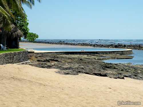 Il y a des bouées installées dans la mer pour bien identifier les zones de baignades où le fond est plus doux. Comme il y a une barrière de roches volcaniques devant la zone hôtelière, cette dernière agît comme coupe-vagues et permet la baignade à marée haute.