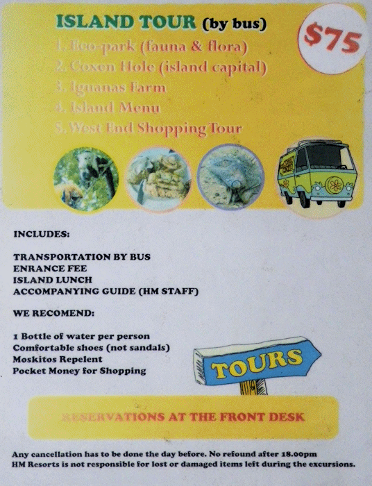 Durant la première journée, nous avons visité West End, Sandy Bay, Antony’s Key et Coxen hole (la capitale de Roatan). La deuxième journée, c’était le secteur est, soit l’hôtel Fantasy Island, le point de vue de nikki beach et jusqu’à Paya Bay. Pour vous donnez une idée des distances, de Paya Baya à Coxen hole (aéroport), 33 km = 45 minutes).